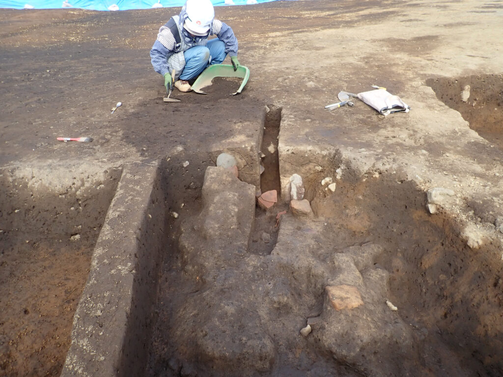 作業員さんが建物跡の内部を少しずつ掘り下げていくと、かまどの周辺を中心に土器が出土します。