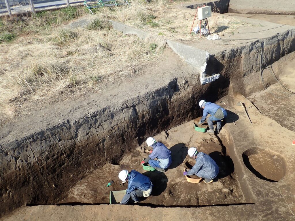 竪穴建物跡の写真を撮るために遺構面を薄く削り、きれいにしているところです。